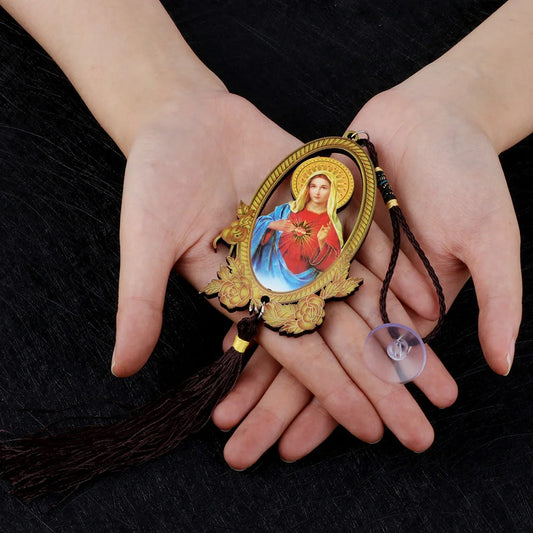 Wooden Long Fringe Car Pendant Classical Christian Sacred Heart of Virgin Mary Rearview Mirror Hanging Ornaments Decoraction