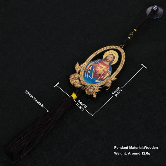 Cottvott 1Pc Car Rear Mirror Hanging Ornament Heart of Jesus Religious Long Fringe Wooden Pendant Car Decoration Accessories